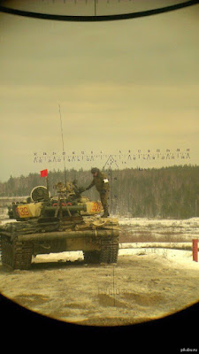 The precision of the UVBU unit is not high compared to the systems employed in more advanced fire control systems as it can only calculate a difference in the angular velocity of the target compared to the tank with a maximum error of 0.53 mils (1.8 minutes of angle). The actual figure displayed to the gunner is rounded up or down in order to fit the graduated scale of the sight viewfinder markings, and the semi-automatic nature of the system means that human error can contribute to the total error margin. The system is generally insufficiently accurate for long range shooting against moving targets, especially with lower velocity ammunition like HEAT and HE-Frag. Other than that, the most serious drawback is the lack of automation. In the fire control system of an M60A3, for instance, lead for a moving target is calculated and automatically applied to the reticle by the ballistic computer after the target is lased, meaning that the reticle automatically adjusts horizontally so that the reticle has already compensated for lead. This allows the gunner of an M60A3 to press the trigger immediately after lasing as long as he continues to track the target with the reticle - no need to adjust the aiming point or use secondary markings to engage. This is faster than the system employed on the TPD-K1M. This is an inherent flaw in the sight itself as it cannot automatically adjust the reticle for lead since it lacks independent horizontal stabilization and there is no provision for the horizontal displacement of the reticle in the viewfinder of the sight. While it may have been considered an innovative feature for a sighting complex from the late 1960's, the UVBU leading system was somewhat crude for 1982 and could already be considered technologically obsolete at the time that it was introduced. By the time the T-72B entered mass production in 1985, the 1A40-1 sighting complex itself could be considered outdated. The TPD-K1M is shown in the two photos below.